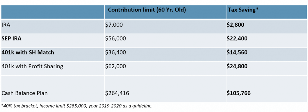 Cash Benefit plan save substantial amount of taxes. If you only have a 401k Plan, or profit-sharing plan, you may not be getting the maximum allowable contribution. For example, in 401k PS plan, the maximum you can contribute is $60,000 (Age over 60) vs in a Cash Balance Plan, you can contribute as high as $ $264,000 (chart below).