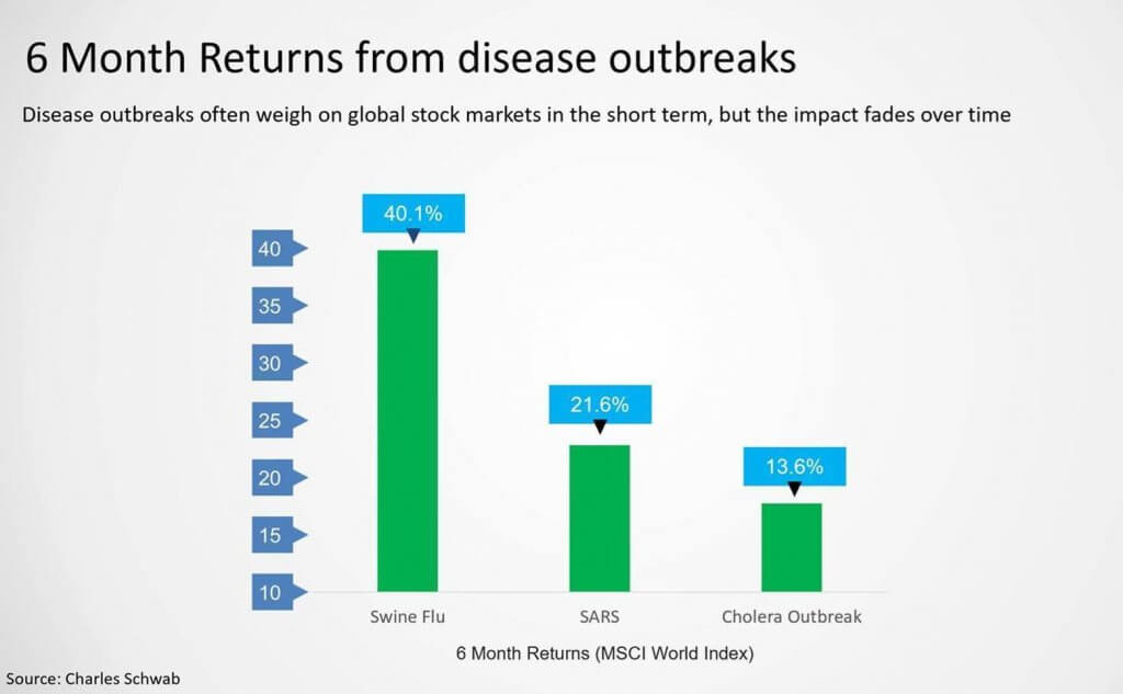 It comes as no surprise that the current situation resulting from the coronavirus creates a great deal of uncertainty. It is impossible to look at the swings in the market and predict how long this situation will last and when the market will turn around and move toward a recovery. However, some things can be learned from looking at historically similar events, such as the SARS outbreak, and one of the things that can be observed is that while there is a definitive short term effect, the long term has shown a market that has recovered and more. Looking at these situations in terms of probability, there is a higher than 75% chance that one year from now the market will be higher than it is currently. In the even longer term, the probability of the market being higher than its current position in ten years is nearly 100%. Taking this into account, a long term investor should not be in a rush to pull out of the market; declines such as this are a time to remain invested or even a time to be seen as an opportunity for buying.