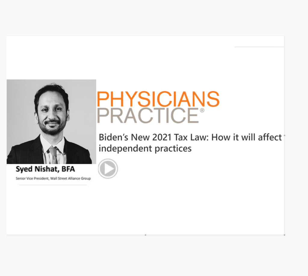 Physicians Practice: Syed Nishat discusses Biden’s Tax Law Syed's Blog Videos In The News Syed Nishat / November 5 Physicians Practice: Syed Nishat discusses how Biden’s New 2021 Tax Law: How it will affect independent practices Sign up for updates & important news Email CommentsThis field is for validation purposes and should be left unchanged. Δ You might also like Wall Street Alliance / December 30, 2022 SECURE ACT 2.0: How does it effect Physician’s Financial Planning? Wall Street Alliance / September 27, 2022 High Inflation Adjustments To Your 2023 Tax Bill – by Johan Vako ;